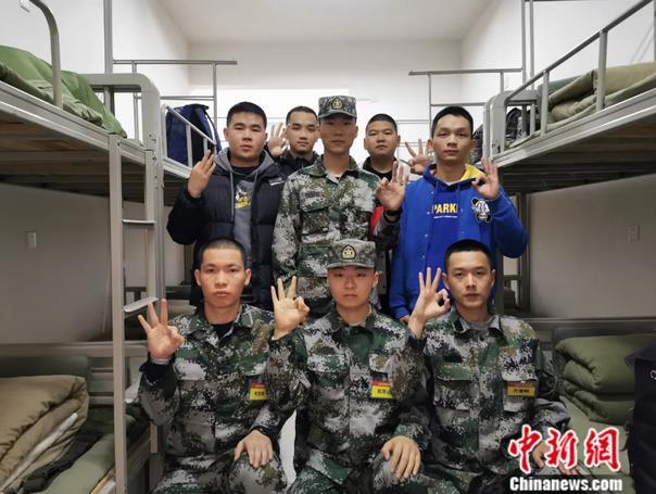 正式入伍前,乔莲畤(左二)在桂林某训练基地,进行为期近半个月的集训。韦莎妮娜 摄