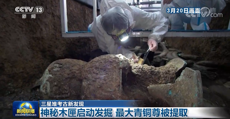 原标题:三星堆考古新发现:神秘木匣启动发掘 最大青铜尊被提取