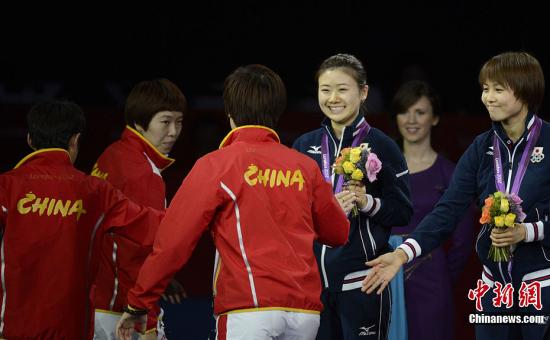 当地时间2012年8月7日,伦敦奥运会乒乓球女子团体决赛中,中国队以3-0横扫日本队摘得金牌。图为福原爱祝贺中国女乒。记者 廖攀 摄