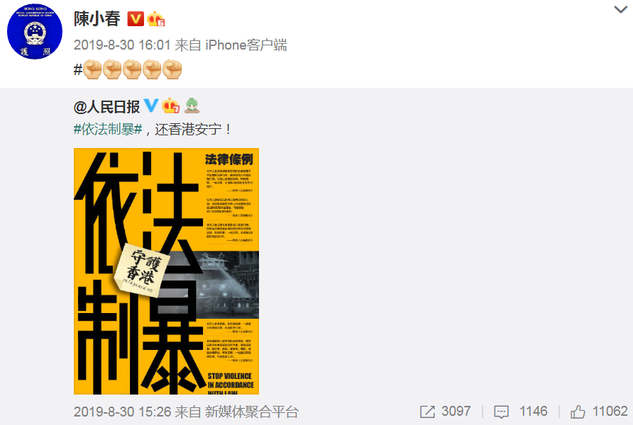 3月19日下午,陈小春在微博上转发了@人民日报 的这张图。