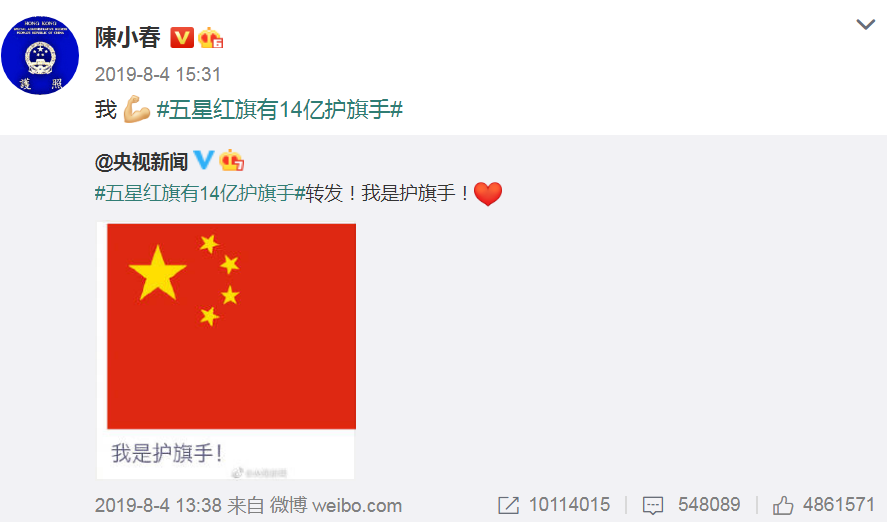 香港“点新闻”今天(22日)注意到了陈小春在微博上的发文,报道称,陈小春表达了自己对国家自豪感。
