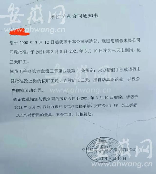 记者从张先生口中得知,亚技精密元件(苏州)有限公司方面以张先生请假未批,旷工三天违反员工守则为由与其解除劳动关系。