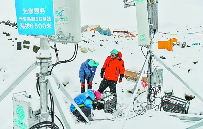 在海拔6500米的珠峰前进营地,中国移动工作人员在调试5G基站。新华社发