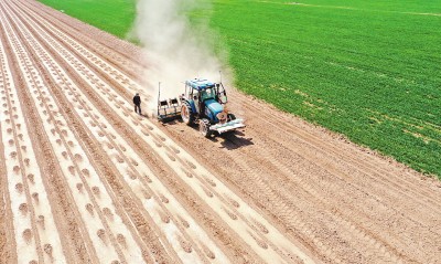 在新疆生产建设兵团第六师共青团农场,一台安装北斗导航自动驾驶系统的播种机在播种棉花(2020年4月8日摄,无人机照片)。新华社发
