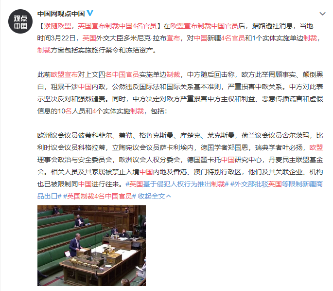 在欧盟宣布制裁中国官员后,据路透社消息,当地时间3月22日,英国外交大臣多米尼克·拉布宣布,对中国新疆4名官员和1个实体实施单边制裁,制裁方案包括实施旅行禁令和冻结资产。