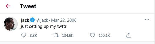 据报道,这条推文已有15年“历史”,是多西在2006年3月首次发布的,上面写着“刚刚建立我的推特(just setting up my twttr)”。