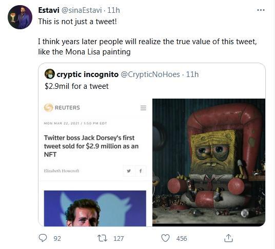 “这不仅仅是一条推文!”埃斯塔维在“推特”上写道。“我想多年以后人们会意识到这条推文的真正价值,就像蒙娜丽莎的画作一样。”