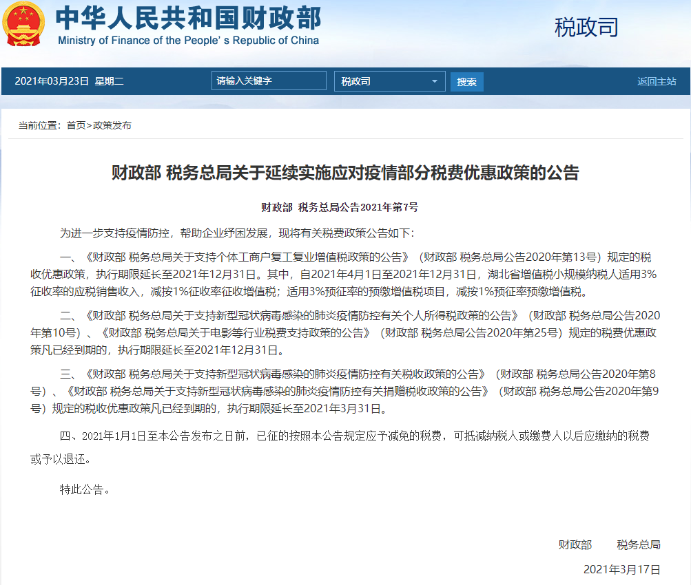 据财政部网站3月23日消息,财政部、税务总局发布关于延续实施应对疫情部分税费优惠政策的公告。