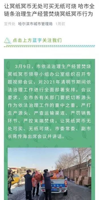 据哈尔滨市城市管理局官方微信消息,3月9日,哈尔滨市依法治理生产经营焚烧冥纸冥币领导小组办公室召开专题视频会议,要求把切断源头作为依法治理工作的重中之重,严打生产源头、严查运输渠道、严罚销售环节、严控末端焚烧,让冥纸冥币无处可买、无纸可烧。