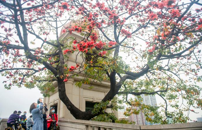 3月23日,初春的广州带着些许凉意,人民桥一株红棉鲜花盛开,吸引了一些摄影发烧友前来赏花拍照。滚滚车流之侧,一树红花令人赏心悦目,不少市民经过时都放慢了脚步,欣赏一番大自然赠予的美丽。文、图/广州日报·新花城记者∶廖雪明