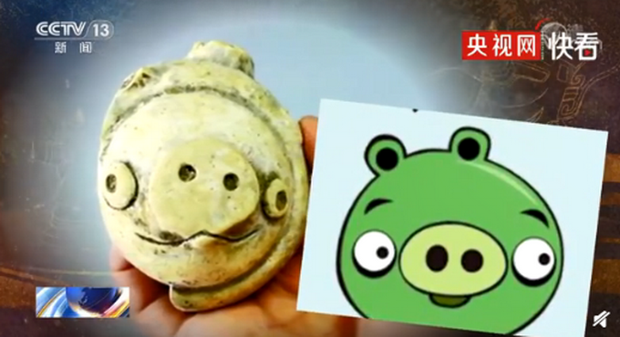 气宇轩昂青铜大鸟头,原型是捕鱼的鱼鹰。鱼鹰在三星堆先民的生活中发挥着重要的作用,三星堆有很多鸟造型的青铜器。此外,还有雄鸡、猫头鹰、狗狗等,最有名的就是一只陶猪,因外形和“愤怒的小鸟”中的反派绿猪撞脸而成网红猪。