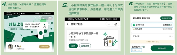 特权领取后,全球通客户将同时收到活动页面弹出的使用提示和星巴克官方下发的引导使用短信。按活动页面提示、短信指引,全球通客户进入最新版星巴克微信小程序“啡快”页面,即可在线上点餐时畅享“买一送一”特权。