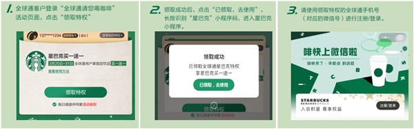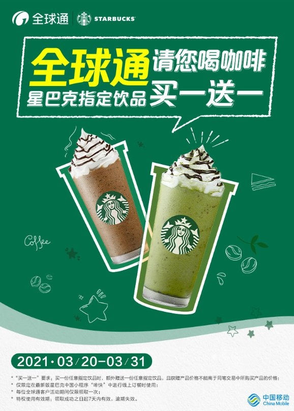 2021年3月20日至3月31日,全球通携手星巴克,诚意奉上第一波优享权益——请全球通用户喝咖啡!让用户在拼搏努力的生活之余喝到一杯精心调制的、热乎乎的咖啡,唤醒元气满满的活力!湖南移动全球通用户可通过发送短信“喝咖啡”到10086领取特权,在星巴克微信小程序“啡快”上点单即可使用。全球通客户还可以通过中国移动下发的短信、公众号推送、全球通专区链接等传播触点,在活动页面里一键登录、验证码登录后点击“立即领取”按钮,将“买一送一”特权领取到登录号码对应的星巴克账号中。