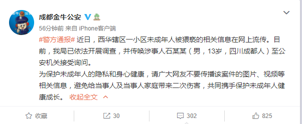 针对网传成都某小区一未成年男孩猥亵同小区女童一事,3月22日晚,成都市公安局金牛公安分局官方微博发布消息称,近日,西华辖区一小区未成年人被猥亵的相关信息在网上流传。目前,公安已依法开展调查,并传唤涉事人石某某(男,13岁,四川成都人)至公安机关接受询问。