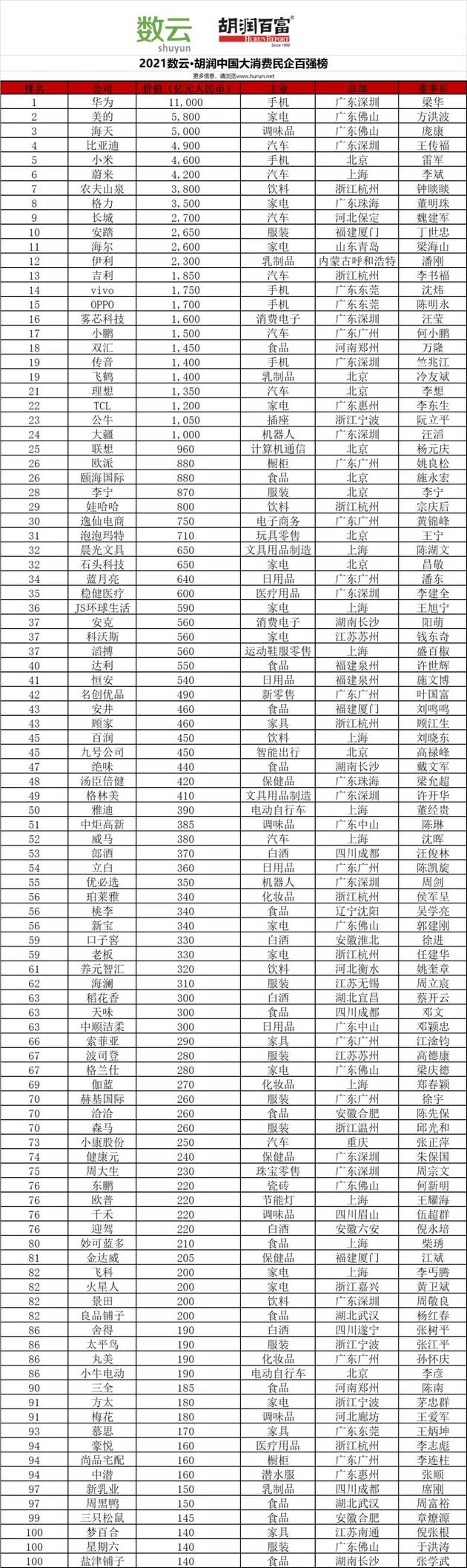 3月23日,胡润研究院发布《2021数云·胡润中国大消费民企百强榜》,这是胡润首次发布大消费类榜单。榜单按照企业市值或估值进行排名,这里的“中国民营企业”是指总部在中国内地的非国有企业。
