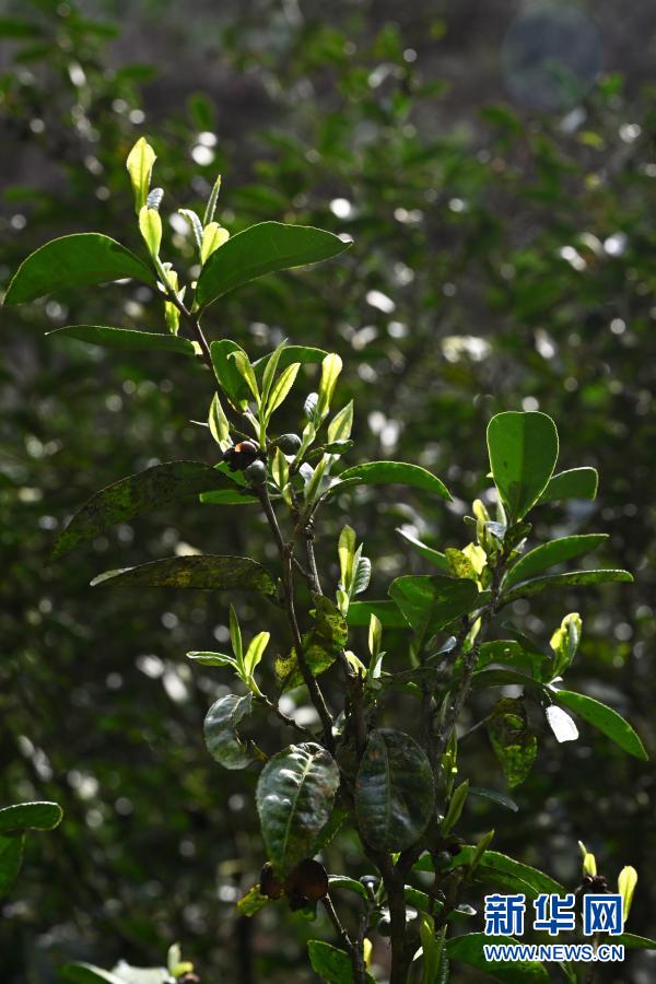 武夷山鬼洞岩茶基地生态茶园茶树冒出新芽(3月23日摄)。