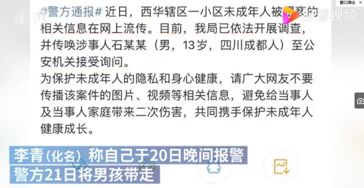 3月22日,四川成都。13岁男孩被指猥亵多名幼童,报警人李青称据统计,已有7人(含1男孩)被猥亵。当天男孩告诉一女孩说躲猫猫让脱衣服,女孩告诉父母才事发。