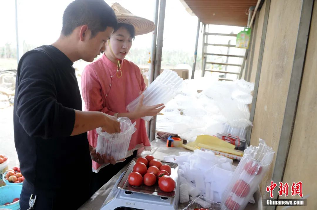 柯嘉华和周晰夫妻俩田间采摘西红柿,并打包寄给客户。中新社记者 张金川 摄