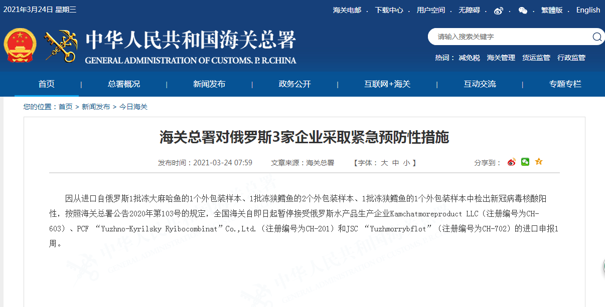 进口水产品外包装检出新冠病毒核酸阳性,海关总署对俄罗斯3家企业采取紧急预防性措施