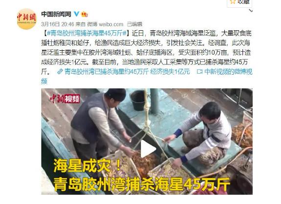 3月上旬,青岛胶州湾海域突然出现大量海星,疯狂捕食养殖区内的蛤蜊、牡蛎等贝类,直接影响养殖户生产养殖以及春季的苗种底播工作。据统计,此次受灾面积约10万亩,预计造成经济损失约1亿元。
