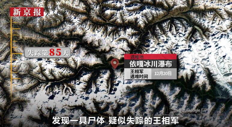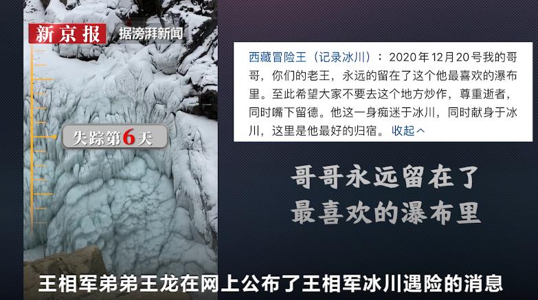 3月22日,据新华每日电讯消息,西藏嘉黎县警方经过DNA鉴定检测,确认3月14日被发现于嘉黎县依嘎冰川的冰层下男尸为“西藏冒险王”王相军本人。2020年12月20日,王相军与同伴前往依嘎冰川拍摄视频,失足滑入水中后失踪。从2017年7月在某平台发布第一条视频起,王相军至今已发布400多条关于冰川探险的视频,先后去过70余座冰川。他曾写“我只是热爱大自然,深入其中,拍照记录,不搞破坏。”