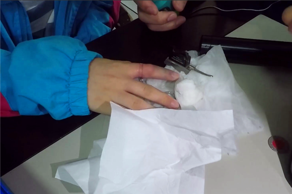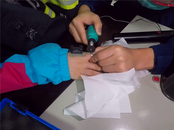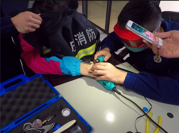为不造成二次伤害,消防员没有贸然施救,在仔细观察了女孩手指被卡情况后,决定使用尖嘴钳,但因戒指太厚,尖嘴钳不能发挥作用。最后,消防员选用了一个功率较大的切割器对戒指慢慢进行打磨切割。