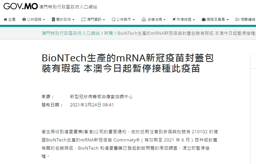 据澳门特别行政区政府网站今日早些时候消息,澳门特区政府24日发布通知称,BioNTech生产的mRNA新冠疫苗封盖包装有瑕疵,澳门今日起暂停接种此疫苗。