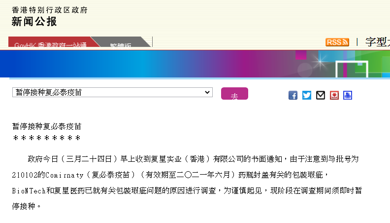 香港特区政府新闻公报3月24日发布消息称,香港特区政府24日早上收到复星实业(香港)有限公司的书面通知,由于注意到与批号为210102的Comirnaty药瓶封盖有关的包装瑕疵,BioNTech和复星医药已就有关包装瑕疵问题的原因进行调查,为谨慎起见,现阶段在调查期间须即时暂停接种。