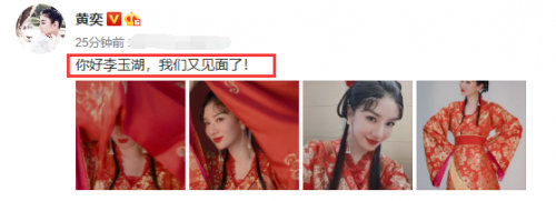 近日,黄奕发微博晒出自己的红衣造型,配文:“你好李玉湖,我们又见面了”。照片中黄奕一袭红嫁衣,一颦一笑还是当年的味道,不禁让人梦回仙女庙,只想感叹一句:爷青回。