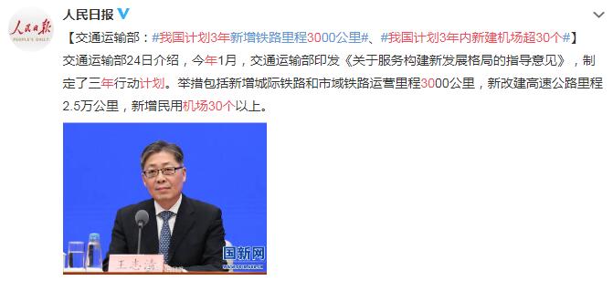 【交通运输部:我国计划3年新增铁路里程3000公里、我国计划3年内新建机场超30个】交通运输部24日介绍,今年1月,交通运输部印发《关于服务构建新发展格局的指导意见》,制定了三年行动计划。举措包括新增城际铁路和市域铁路运营里程3000公里,新改建高速公路里程2.5万公里,新增民用机场30个以上。