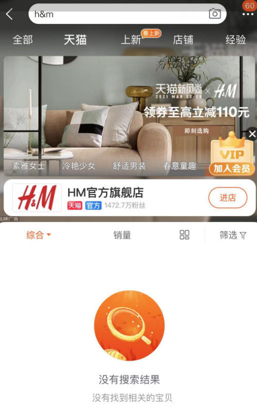 3月24日下午,在京东、拼多多搜索H&M、HM等关键词,均未显示相关店铺和商品。天猫最新搜索结果显示,所有“H&M”和“HM”搜索均无结果。早在半小时之前,相关商品为正常显示状态。