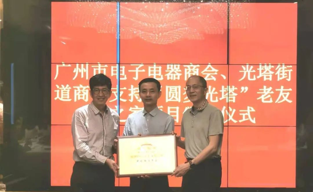为感谢商会对“圆梦光塔”老友记之家项目支持,光塔街党工委书记阮雄、街道办事处主任谭建光向广州市电子电器商会、光塔街道商会颁牌。