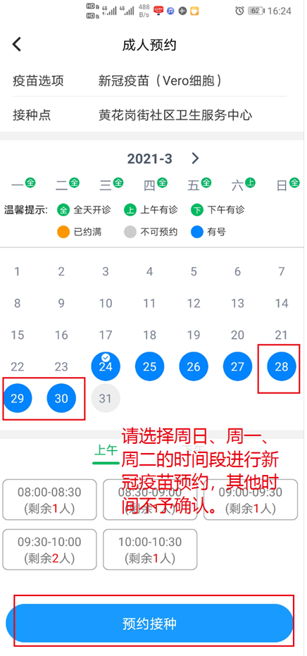 3、选择接种时间(由于中心目前仅开放每周的周日、周一、周二供居民预约接种,其余时间即便选择了也不予确认)。