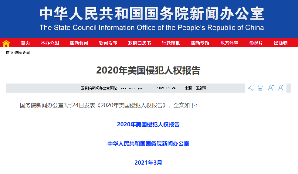 国务院新闻办公室24日发表《2020年美国侵犯人权报告》,对美国侵犯人权的状况进行揭露。