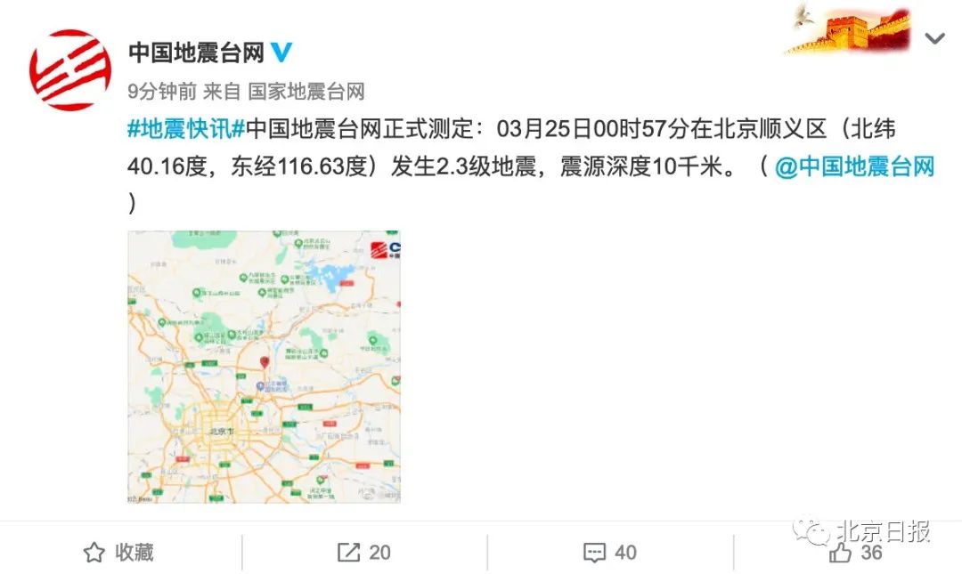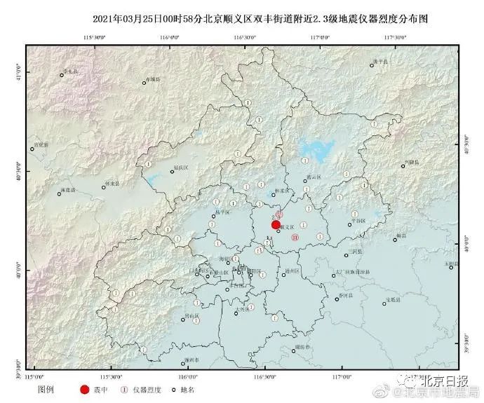 据@中国地震台网 正式测定:3月25日00时57分在北京顺义区(北纬40.16度,东经116.63度)发生2.3级地震,震源深度10千米。