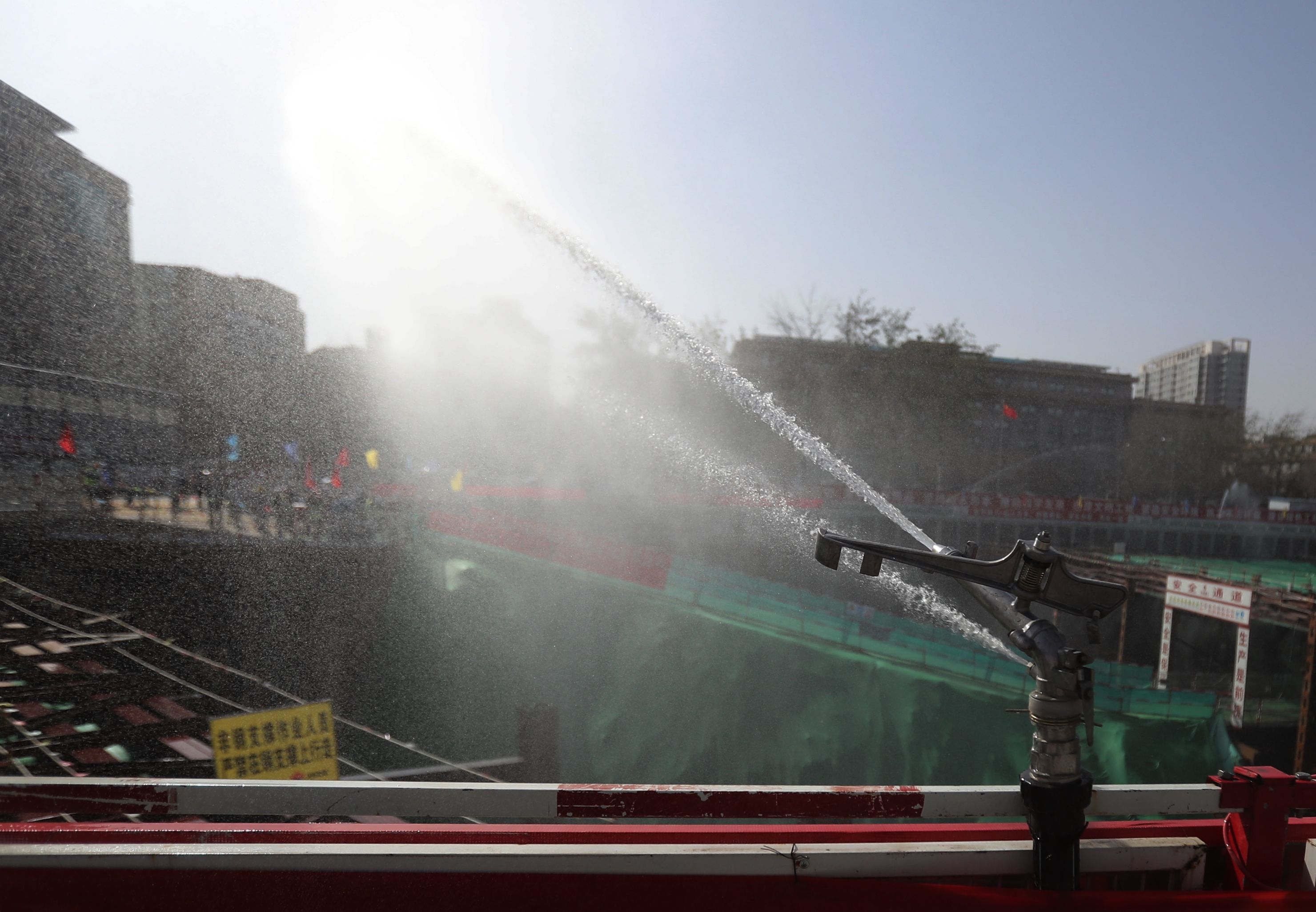 在百万庄北里施工现场,工地钢架上方正在移动的绿色天幕引人注意。记者看到,这片天幕覆盖了整个施工地块,防止施工产生的沙尘向外界扩散。与此同时,天幕钢丝绳上的众多喷淋设备喷洒着水雾,打湿空气中的沙尘,犹如给工地“淋浴”,这是防尘的第二道保险。施工队的工人们就在绿色天幕下和水雾中穿行、作业。