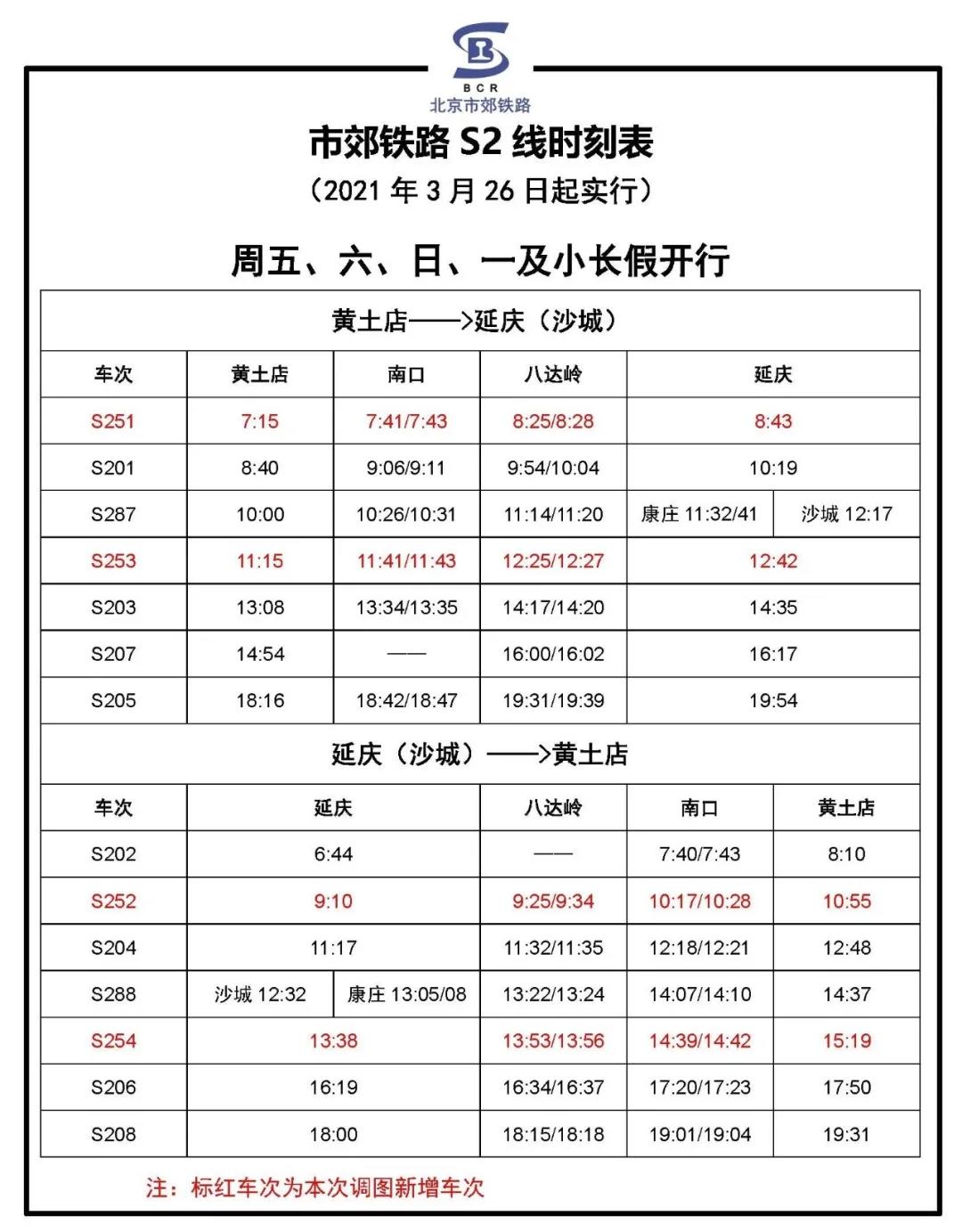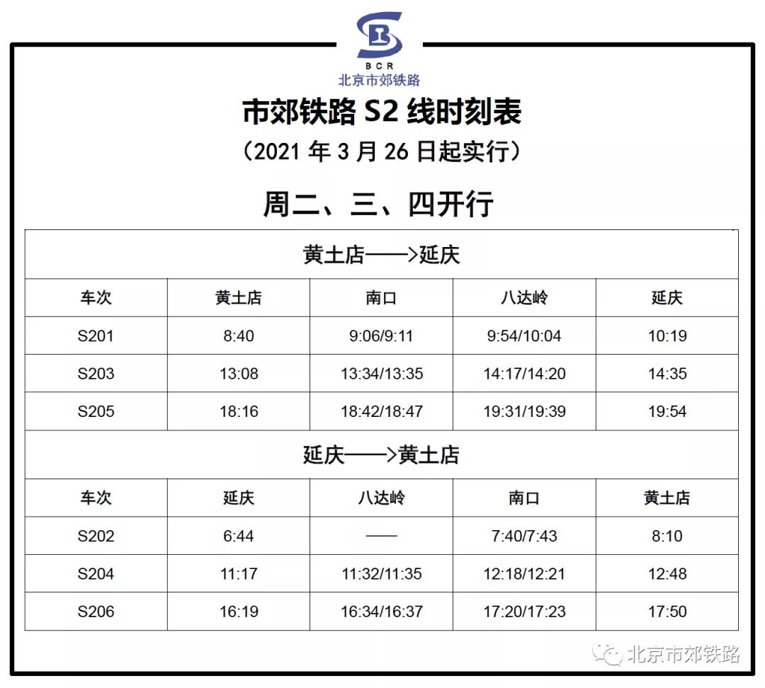 据北京市郊铁路官微消息,为满足花期旅客乘车赏花的出行需求,自3月26日起,市郊铁路S2线周五、六、日、一及小长假每日增开2对列车,其中,黄土店站至延庆站方向增开7:15和11:15发车的列车,延庆站至黄土店站方向增开9:10和13:38发车的列车,原既有5对列车的开行时点保持不变。周二、三、四仍维持3对/日的列车开行方案,开行时点保持不变。