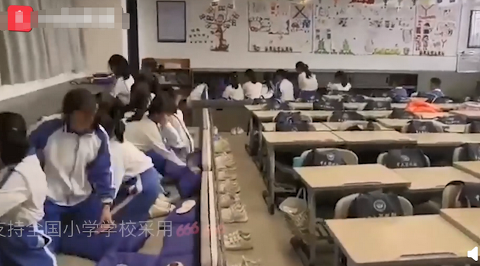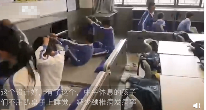 3月23日,广东深圳,一段小学生中午在午休床上休息的的视频走红。视频中同学们将桌椅移到中间,拉开两侧的折叠床,统一排队上床休息。不少网友点赞该设计,孩子们中午不用趴在桌子上睡觉了。