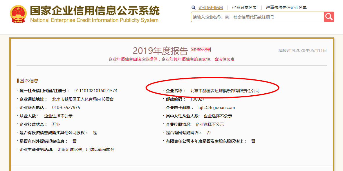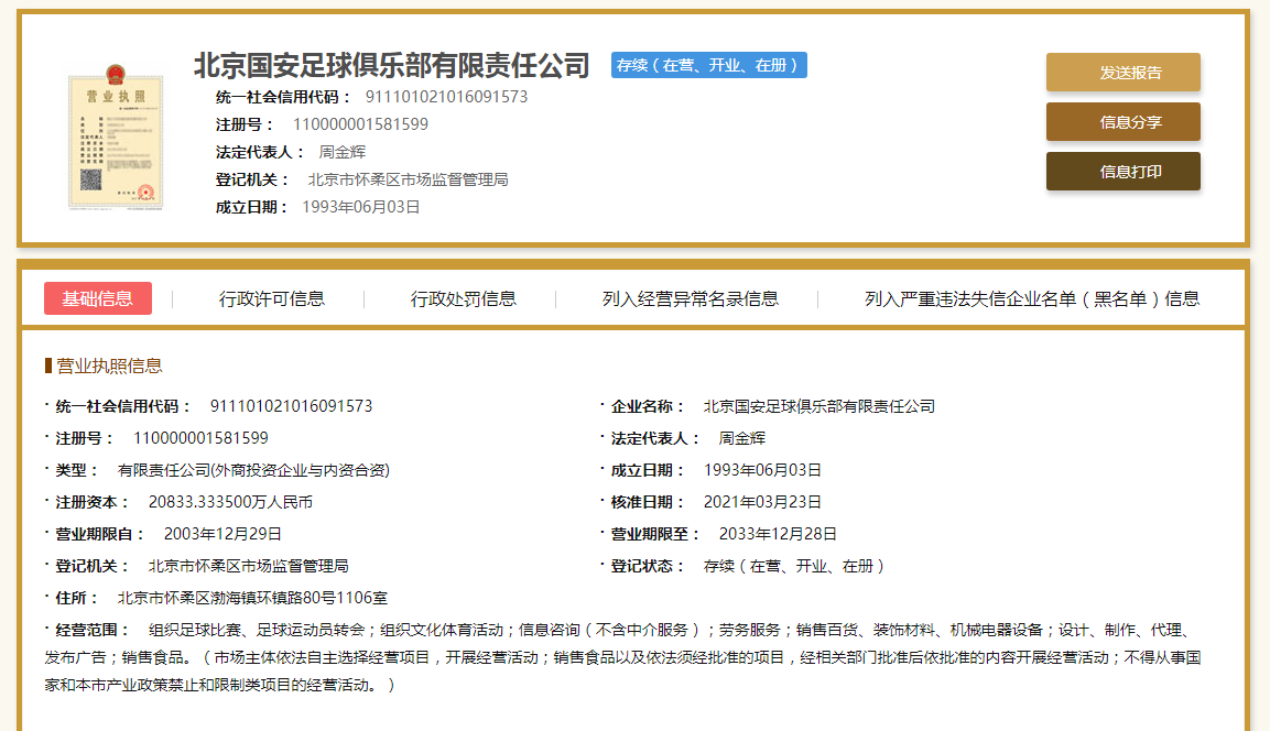 新京报讯 日前,北京中赫国安完成工商更名手续,正式更名北京国安。国家企业信用信息公示系统显示,北京中赫国安足球俱乐部有限责任公司(下图)已完成更名,变更为“北京国安足球俱乐部有限责任公司(上图)”,核准日期为3月23日。