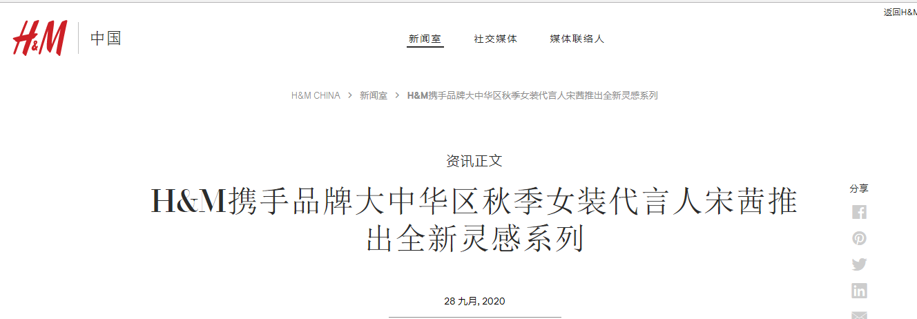 根据H&M官网信息,2020年9月,H&M宣布宋茜成为品牌大中华区秋季女装代言人。