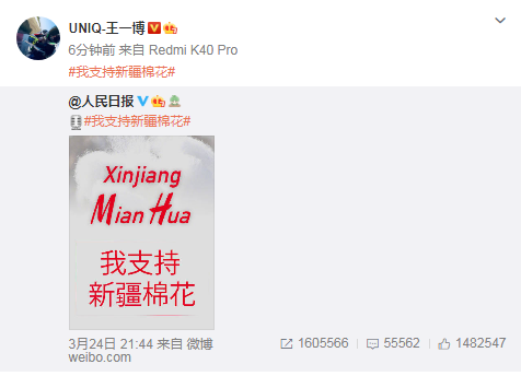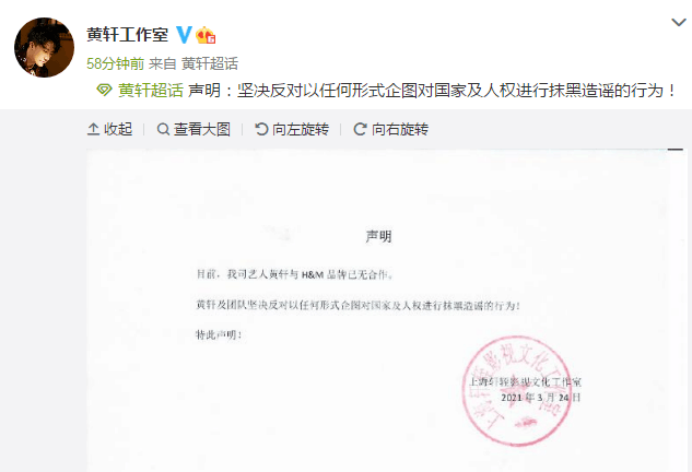 “H&M声明抵制新疆产品”引发中国网友激烈不满。黄轩工作室在微博上发文称,黄轩与H&M品牌已无合作,坚决反对以任何形式企图对国家及人权进行抹黑造谣的行为。