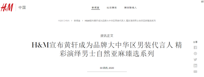 根据H&M官网信息,2020年4月,H&M宣布黄轩成为品牌大中华区男装代言人。