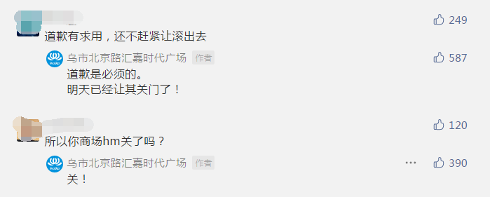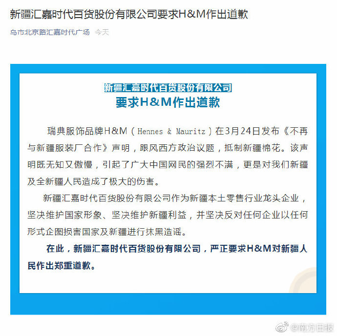 今天,新疆汇嘉时代百货股份有限公司在公众号发布文章称,HM的声明既无知又傲慢,引起了广大中国网民的强烈不满,更是对我们新疆及全新疆人民造成了极大的伤害。严正要求H&M对新疆人民作出郑重道歉。