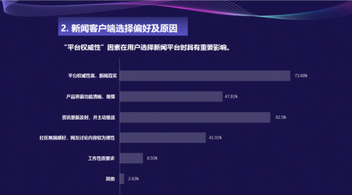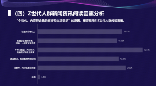据报告显示,73.68%的Z世代人群在选择新闻平台时注重平台的权威性,认为由权威平台发布的信息更具有可信度。72.64%的Z世代人群认为在阅读新闻资讯时偏向个性化的内容,切合自身兴趣、符合自身喜好和生活需求的新闻更具备可读价值。