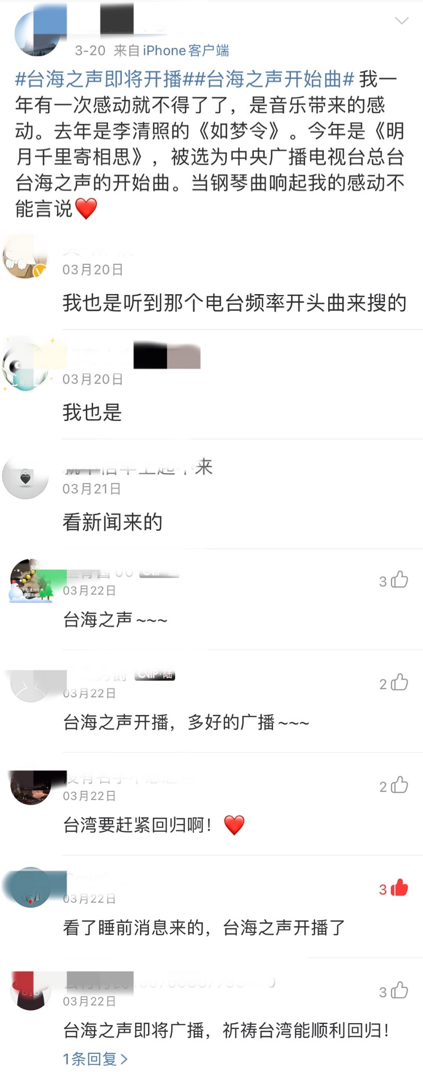 未开播,曲先传。20日,“台海之声”发布开始曲《明月千里寄相思》后,一众网友涌到微博和音乐平台中搜索原曲重温细品,表达对歌曲的喜爱和对“台海之声”的期待。