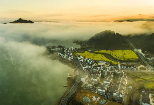 2021年3月23日,雨后的浙江省杭州市淳安县安阳乡,乡村云雾缭绕,峰林在飘渺的云雾间忽隐忽现,宛若仙境,吸引众多游客前来踏青赏景。