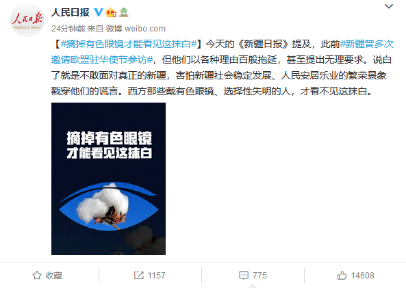 今天的《新疆日报》提及,此前新疆曾多次邀请欧盟驻华使节参访,但他们以各种理由百般拖延,甚至提出无理要求。说白了就是不敢面对真正的新疆,害怕新疆社会稳定发展、人民安居乐业的繁荣景象戳穿他们的谎言。西方那些戴有色眼镜、选择性失明的人,才看不见这抹白。
