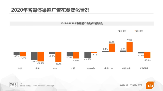 根据CTR媒介智讯发布的《2020年中国广告市场年度报告》显示,2020年中国广告整体刊例花费同比下降11.6%,但分众电梯广告花费仍逆势高速增长,并成功打造众多品牌引爆案例。