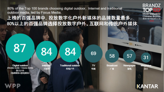 而在WPP与凯度共同发布的2020年“BrandZ™最具价值中国品牌100强”榜单中,投放分众为代表的数字化户外新媒体的品牌数量占87%。