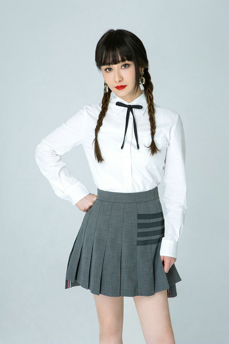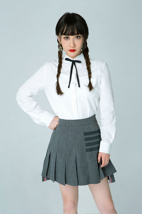 陈德容此次的宣传大片颠覆以往风格,仅以简单的白衬衫搭配灰色百褶短裙,极简的二次元漫画少女风令人耳目一新。脚上以白色长筒皮靴、黑色的丝带领结,更增添了些许俏皮与活力,整体装扮简约又充满精致感,彰显了陈德容元气满满、活力十足的一面。